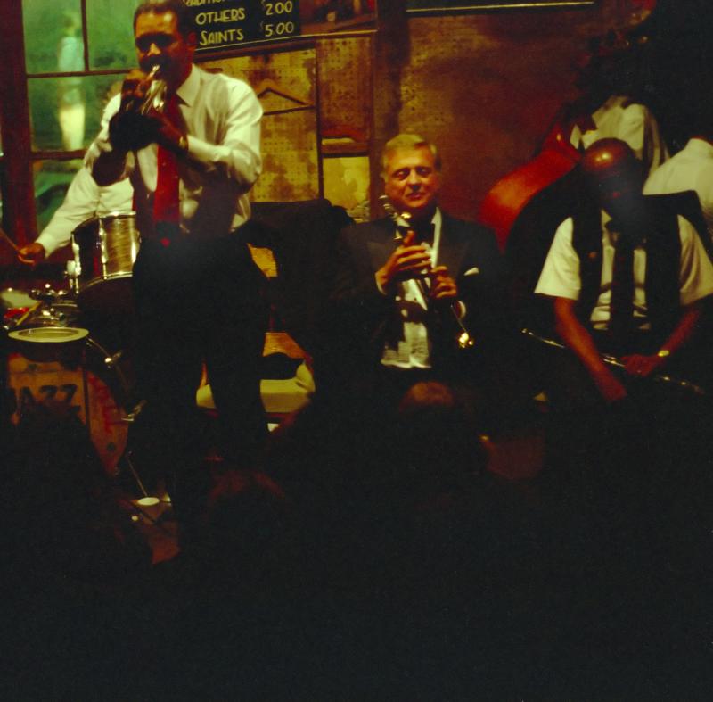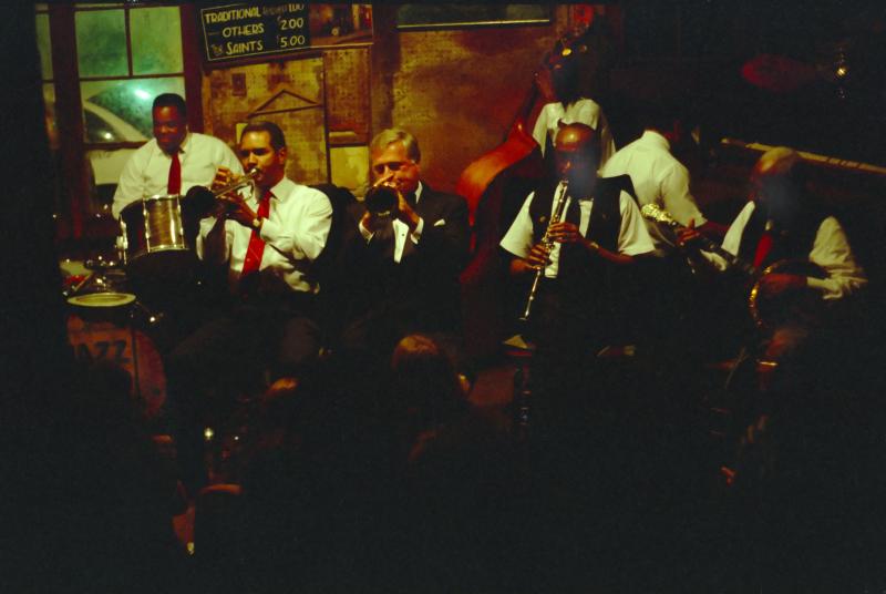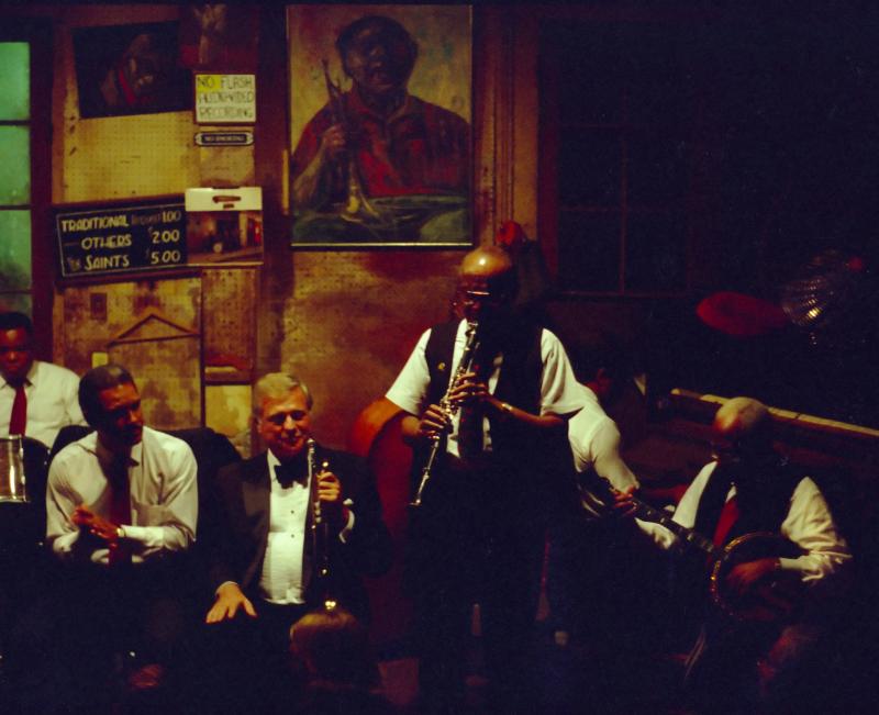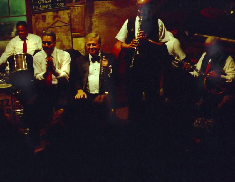 December 1995 I visited my marine engineer son Raymond in New Orleans while he was in port there. The two of us visited the local bars and music venues, including this one, The Preservation Hall Jazz Band. Their music brought tears to my eyes. The banjo player was a hundred years old. Al Hurt and his trumpet was a surprise guest that night. I would love to get some of the other names here, . . . . anybody looking in know the names of the players in these pictures?